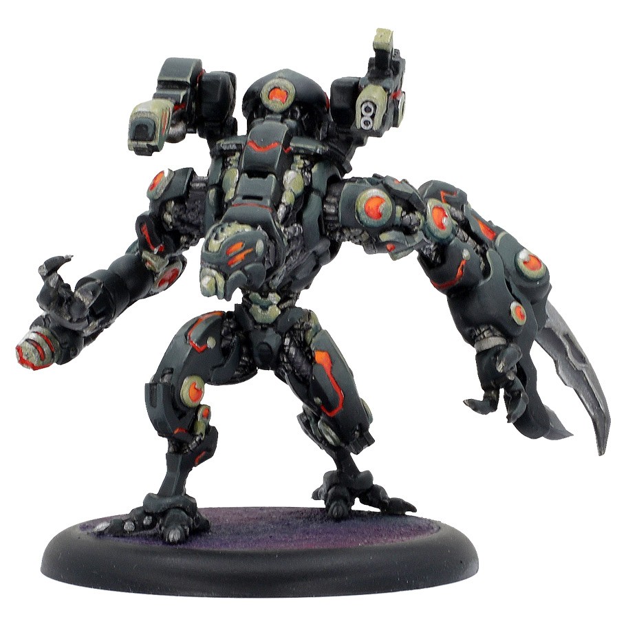 A misshapen horror of steel and malice, the Scourge is a brutally effective melee-focused warjack. Though it can be equipped with a variety of destructive weapons, the chassis’ defining features are its huge Wrecking Claw and iron-spring servos that can be charged to vastly increase the raw physical strength of the machine. The Scourge’s savage cortex options instill the warjack with an animalistic cunning and savagery that befit its hulking design.