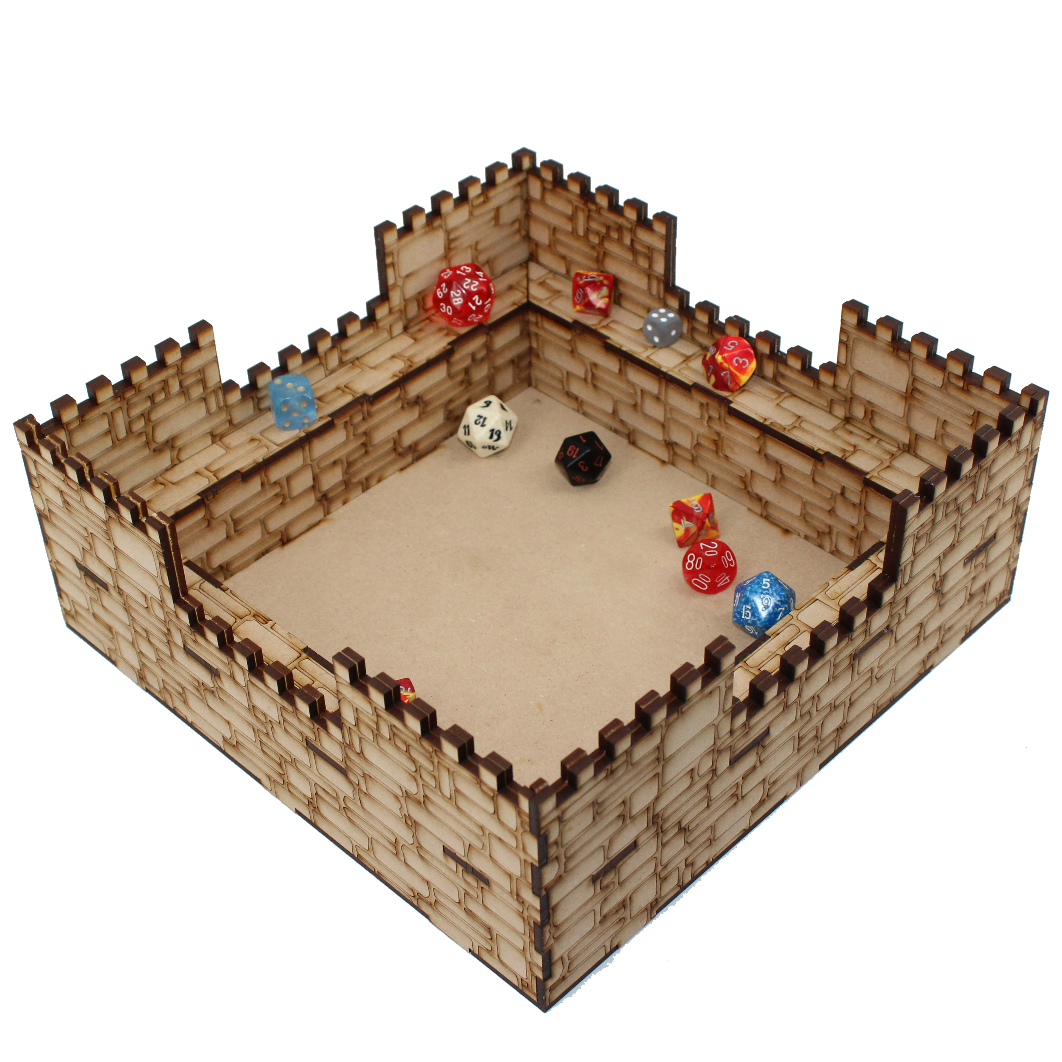 Keep your dice well protected (and off the floor!) with our Castle Dice Tray. Ten inches square and nearly 4 inches tall, the castle features stonework detailing, inside & out, with a one inch wide inner ledge for storing dice and figures when not in use.