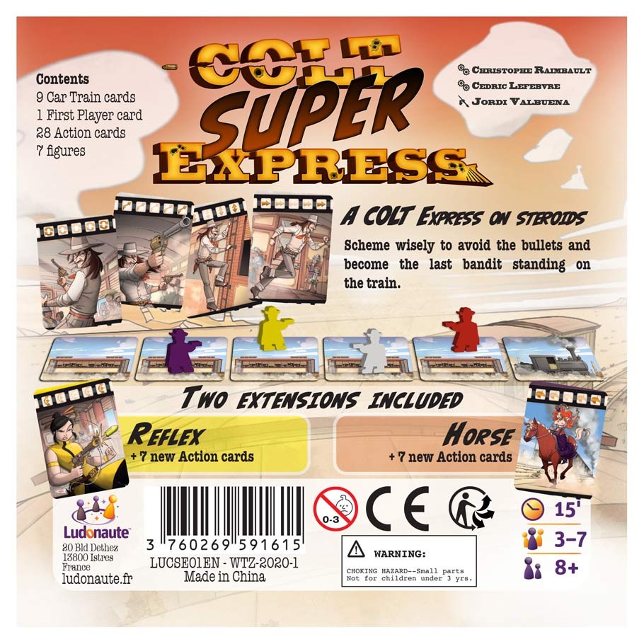 Colt Super Express has the spirit of the original, award-wining Colt Express in the form of a fast-paced, survive to win format that players can take anywhere. Players compete to be the last Colt Express rider standing because there can only be one when this train stops. Each round, players will place one of their five action cards face down in a pile to determine their what they’ll do when they are revealed, including moving, shooting, and more. At the end of the round, the last train car is removed . . . and so is anyone in it! If more than one player is alive in the final car, the entire train explodes, taking them with it.