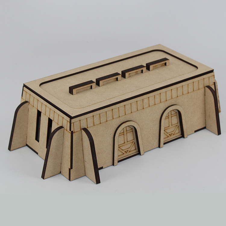 Zeeba's is a sloped wall, single-story rectangular structure occupying roughly 11 & 1/2 by 7 & 1/2 inches and 3 & 1/2 inches tall. Features include reinforcing buttresses, laser etched detail, and roof vents / indirect lighting windows depending on how you paint it. The roof is removable for full access to the structure. Made of sturdy 3mm MDF board and precision laser cut
