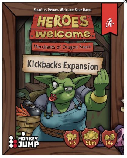 Looking for more ways to swindle heroes? The Heroes Welcome: Kickbacks Expansion expands on the Eager Customer marketplace with Kickback cards, adds new customers, and allows you to randomize the starting shops in Heroes Welcome. Requires Heroes Welcome Base Game.