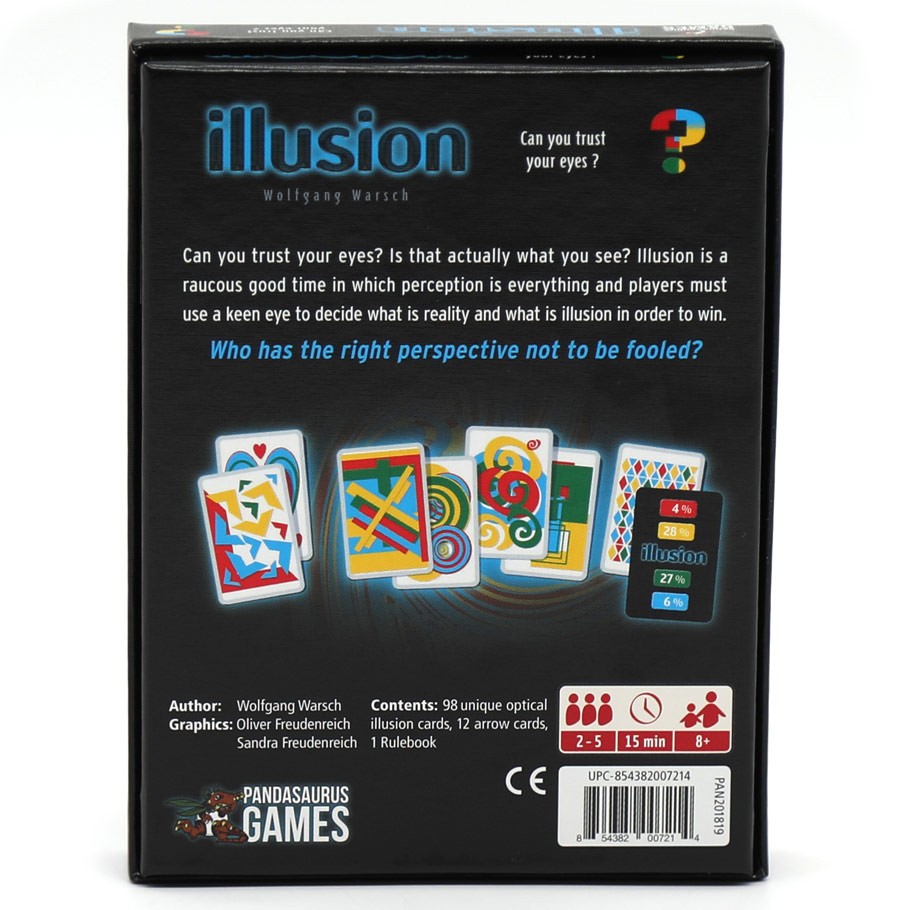 Can you trust your eyes? Is that actually what you see? Illusion is a raucous good time in which perception is everything and players must use a keen eye to decide what is reality and what is illusion in order to win. Who has the right perspective not to be fooled?