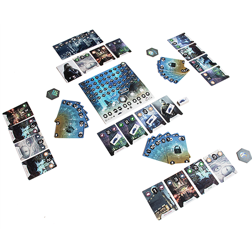 Influentia is a card game based on classic trick-taking card games. In each trick, players play one of their Resource Cards. The winner of the trick may choose one of the City Cards from among those available or the Resource Card that was just played by another player. The other players keep the cards they played as these will allow them to activate a variety of effects once they have two identical Symbols. After 3 rounds, the player who has won the most victory points wins the game.