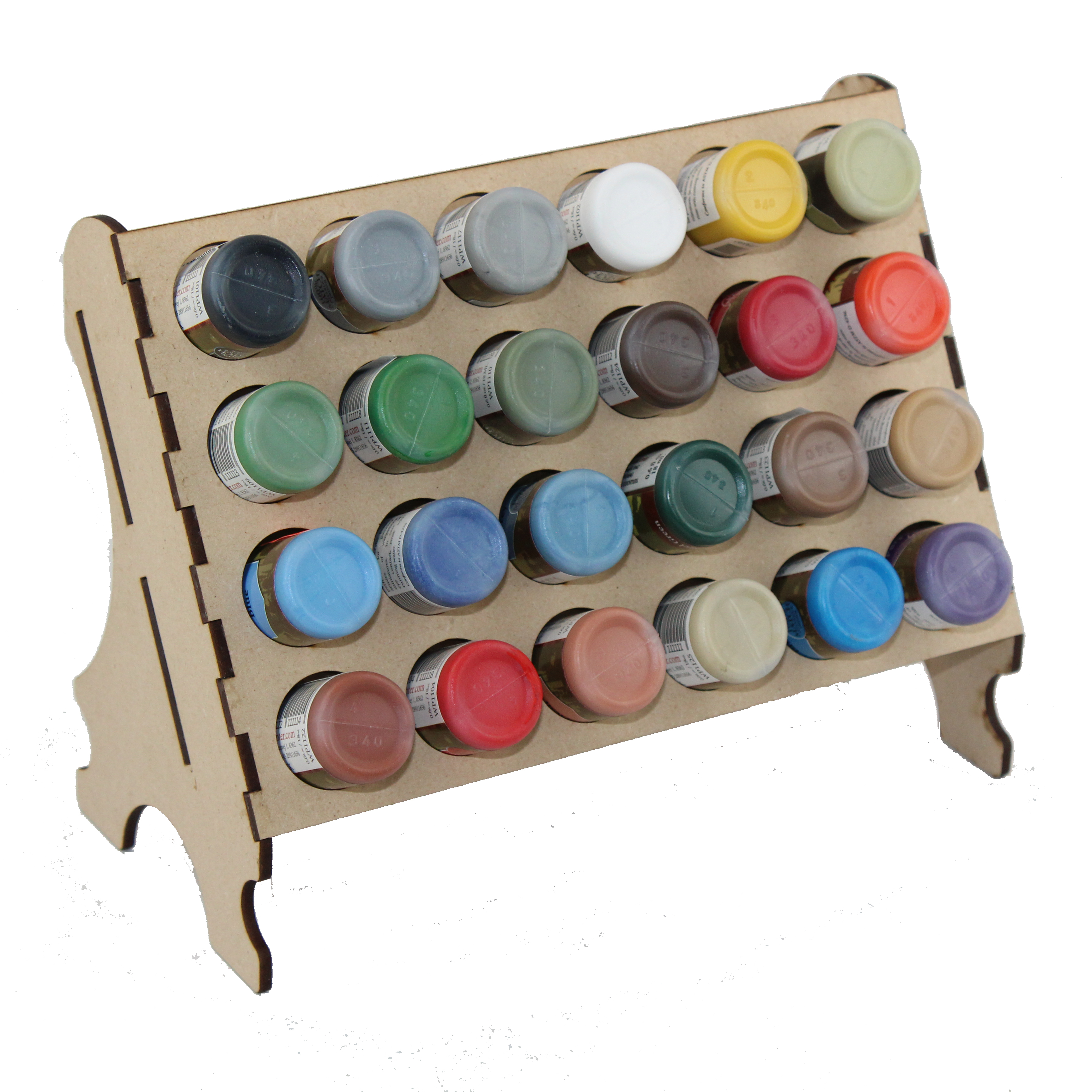 A simple upright paint storage rack with a capacity for 24 narrow "dropper bottle" style paints. This rack supports paints with a body diameter of no more than 25mm; including 17mm Vallejo branded and 18mm The Army Painter branded bottles.