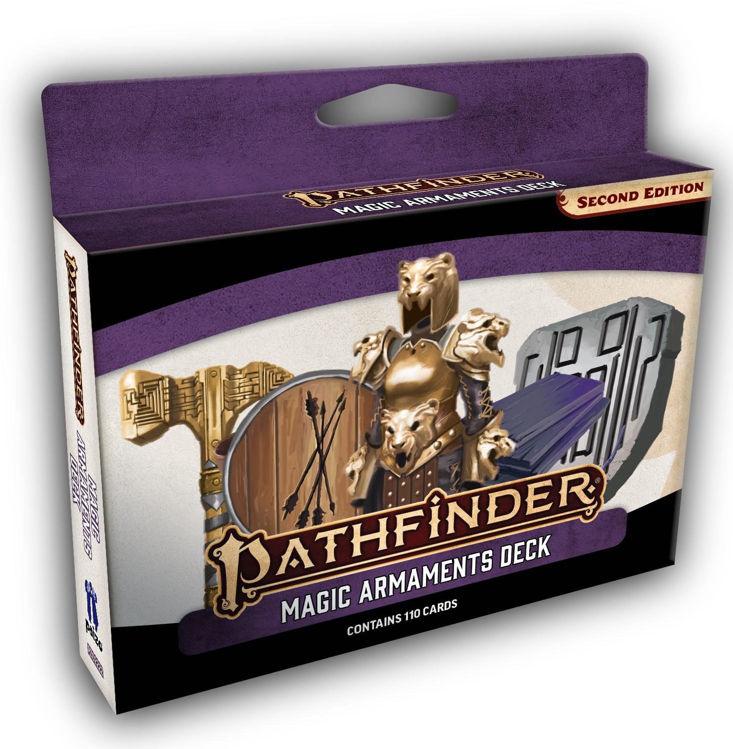 A hero collects treasure at every step of their journey, and no treasure is more prized than mighty magical weapons and incredible enchanted armor. The Pathfinder Magical Armaments Deck contains 110 cards detailing every magical armor, weapon, and shield in the Pathfinder Core Rulebook, along with runes and special materials. Each card features statistics, descriptions, and beautiful full-color illustrations. Whether you’re a GM building a cache of loot for the heroes to find, or a player taking the next steps of a hero’s journey, the Magical Armaments Deck keeps your fantastic gear at your fingertips!