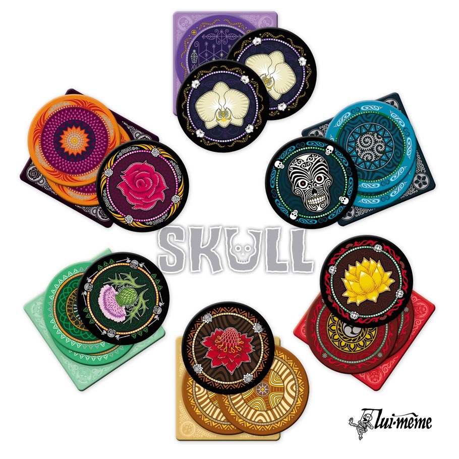 An ancient game of ornate skulls and deceptive flowers, Skull is simple to learn, but dangerously difficult to win. If you want to best your opponents, you must bluff, lie and pierce the deceptions that surround the flowers. Be wary, though—if you reveal a skull, the consequences are dire! Each turn, you may either add another disc to your pile or bet how many flowers you can reveal without revealing a skull. If you succeed at your bet, you gain a point, and two points wins the game! But you can be sure your opponents won’t just let that happen. Keep your cards to the bitter end to win this game of deception and perception.