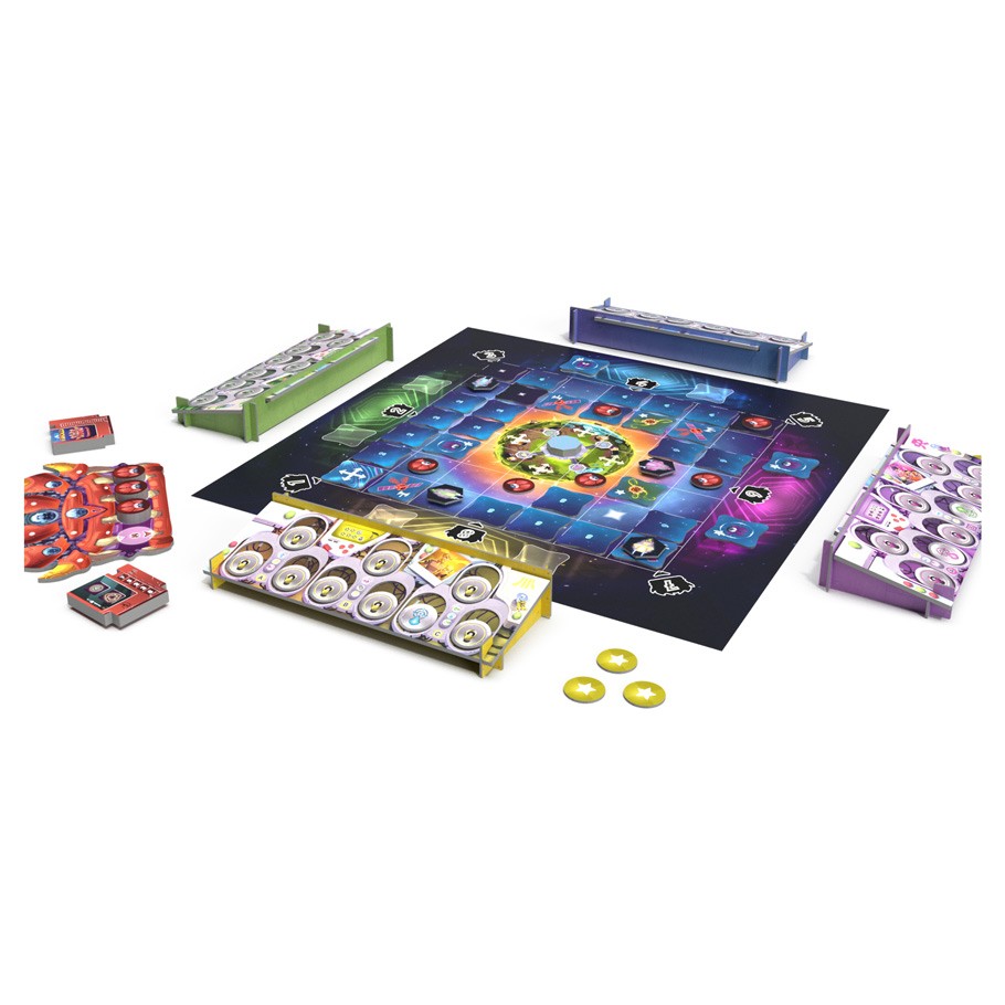 Each turn, all players press, in the order they want, 2 of the 9 buttons on their cockpit dashboard and instantly apply their effect. These buttons allow you to move around in space, shoot a ship or activate the copy action. Each time you move onto a new Space tile, you flip it. If you find out a jammer, you must use 1 energy to destroy it. All players start with 1 energy and can gain 1 energy from each enemy ship killed. Be careful not to shoot a friend, you would make him lose 1 energy. When all players have pressed their two buttons, they flip them again. Please note: it’s great not to forget them for the next turns. Then reveal the end of turn floppy and apply its effect. Alien Spaceships are coming from all sides! When an Alien Spaceship reaches the center of your planet, it destroys a protective shield. If three of them reach it, you lose. To win you must destroy all the hidden jammers in order to call your parents to the rescue.