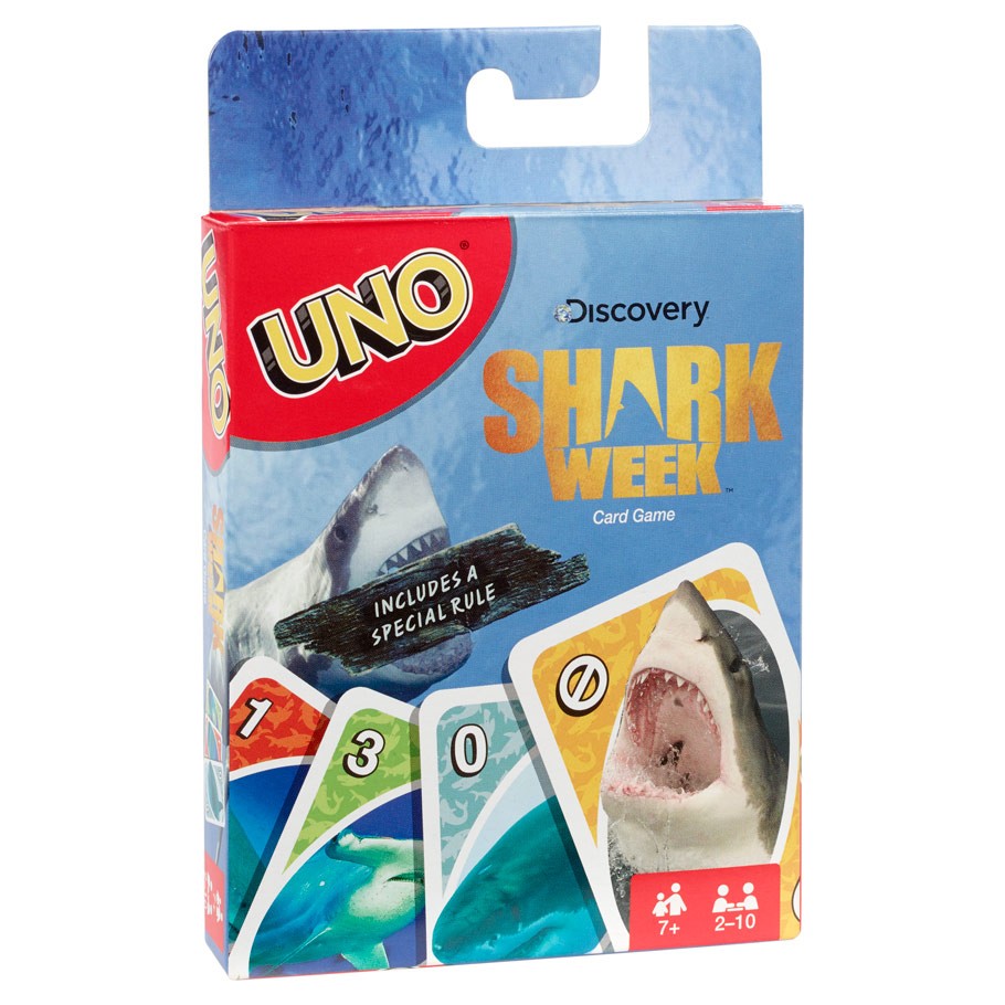 Now UNO™ has teamed up with Shark Week™! It's the classic UNO™ you love, but this version includes cards featuring ferocious shark images and comes with the Shark Attack card! When this special card is played, all players must race to put their hand on the discard pile. The last player to do this gets "attacked" and must draw four cards. Score points by being the first to get rid of all the cards in your hand. First player or team to 500 wins. When you're down to one card, don't forget to yell "UNO!"