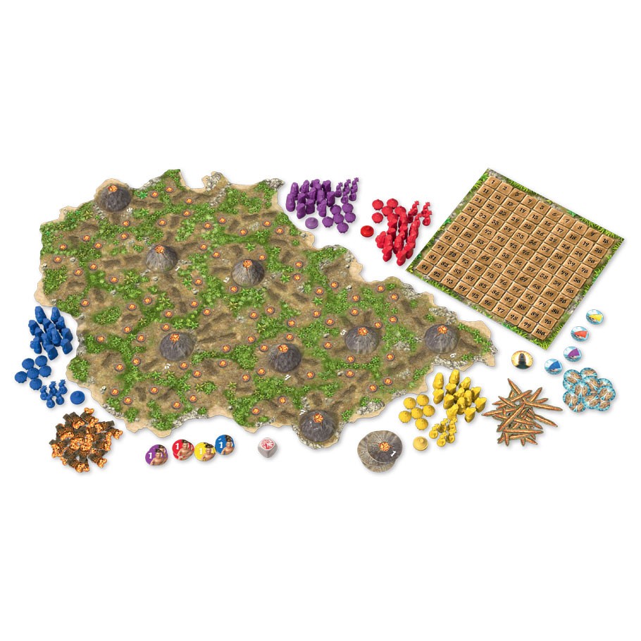 Long ago, Easter Island was once a vast continent ravaged by constant volcanic activity. The settlers of this land raised Moai --gigantic monolithic statues to appease the gods and mend the wounds of the land. Unfortunately, instead of healing the land, the very act of sealing off craters and geysers caused an even greater disaster to unfold... Players in Volcanic Isle are tasked with building villages and raising Moai across the continent. However, with each Moai raised, the possibility of a volcanic eruption increases! Eruptions devastate settlements and cause whole sections of the board to sink into the sea and be removed!