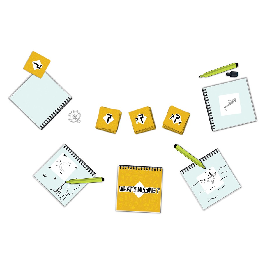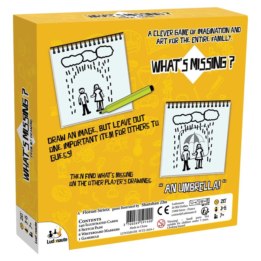 What’s Missing? is a party game of imagination and art in which players have to draw so that their friends can guess a picture. But instead of drawing the actual picture, they will draw everything around it! Players all draw a random image card and draw a picture around it in 10 seconds. Their art around the hidden image card is then revealed and everyone begins guessing, claiming the hidden image if they guess correct. If players want to win, being smart is more important than being a good artist.